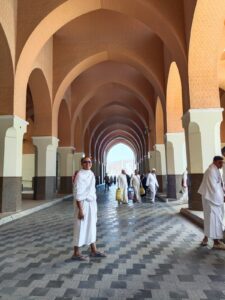 Saat memasuki pelataran masjid, jemaah akan disambut oleh deretan pohon palem dan taman yang tertata rapi. Suasana di sini selalu terasa magis; ada perpaduan antara kesibukan ribuan jemaah yang bersiap dan kesyahduan talbiyah yang mulai berkumandang.